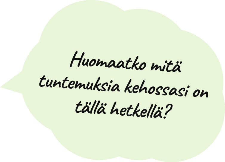 Voisitko välillä pysähtyä havainnoimaan mieltä, kehoasi ja eri tuntemuksia? Aloita keskittymällä hengitykseen ja halutessasi voit sulkea silmäsi, jotta pääset keskittymään paremmin kehoosi. Tunteita ei tarvitse etsiä, jos niitä ei tällä hetkellä huomaa. Tarkkaile ensin liikkuuko mielessäsi erilaisia tunteita. Mitä tuntemuksia kehossa on? Voiko jonkin tunteen takana olla toinen tunne? Huomaatko vältteleväsi jotain tuntemusta? Anna tuntemusten olla sellaisena kuin ne ovat. Huomioi miten tunteet ja tuntemukset saattavat vaihdella. Voit tehdä tämän muutaman minuutin pituisena pysähtymisenä tai pitempänä harjoituksena.