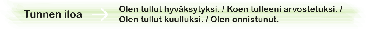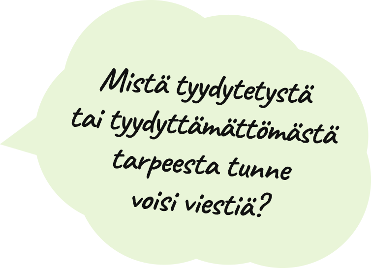 Kun olemme pysähtyneet tunteen äärelle, voimme miettiä, mistä tarpeesta se haluaa viestiä. ”Minulla on ______ tunne, koska tarvitsen…” Pysähtymällä kuuntelemaan tunteidesi viestejä itsetuntemuksesi kasvaa ja huomaat omia arvojasi paremmin.