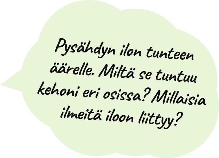- Kun huomaat myönteisen tunteen kehossasi, nimeä ne. Pysähdy tietoisesti tunteen ääreen pidemmäksi aikaa. Nauti tunteesta.