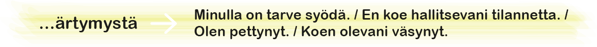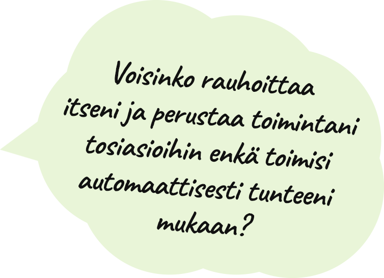 Joskus tunteet saattavat tulla niin voimakkaina esimerkiksi vuorovaikutustilanteissa, ettemme pääse tunteen ja reaktion väliin. Tällöin voit ottaa asian puheeksi toisen osapuolen kanssa tilanteen jälkeen. Tunteisiin ei tarvitse jäädä kiinni pohtien ja analysoiden tapahtumia. Asiat voi vain todeta.